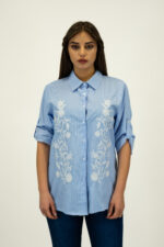• Design: Presenta una chiusura con bottoni e un colletto classico, con maniche lunghe arrotolabili. I ricami floreali lungo il davanti conferiscono un tocco di originalità e raffinatezza.